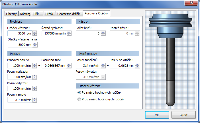 Ve výchozím nastavení je tato možnost zapnuta. Všechny nástroje (kromě levostranných závitníků) se otáčí ve směru pohybu hodinových ručiček (M3).