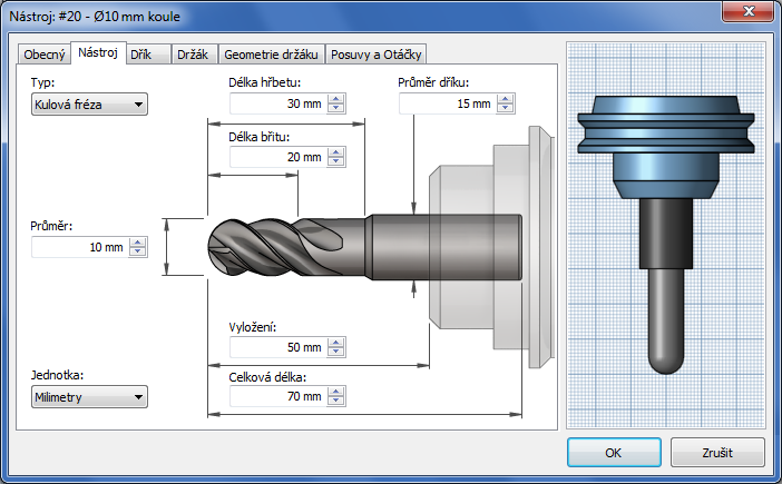 V náhledu na pravé straně dialogu se zobrazí tvar nástroje, který se automaticky aktualizuje po provedení jakékoli změny.