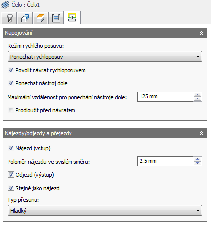 Pokud je tato možnost povolena, provádí se návraty rychloposuvem (G0). Tuto možnost zakažte, chcete-li vynutit návraty rychlostí posuvu odjezdu.