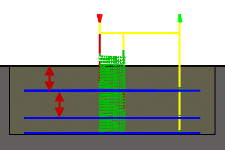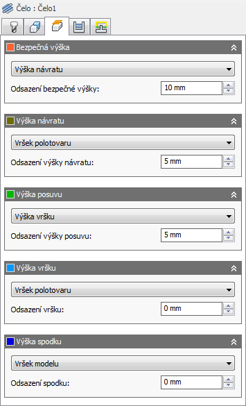Režim výšky návratu nastaví výšku, do které se nástroj posune před dalším řezným průchodem. Režim výšky návratu musí být nastaven na hodnotu vyšší, než je nastaveno u parametrů Výška posuvu a Horní část. Režim výšky návratu se používá spolu s následným odsazením ke stanovení výšky.