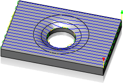 Při použití omezení spádu a/nebo zbytkového obrábění u operace rovnoměrného dokončení lze zaškrtnout políčko Obrobit oblasti pomocí hranic, a zahájit tak odsazování dráhy nástroje od hranic vytvořených na základě detekování spádu a/nebo zbytkového materiálu.