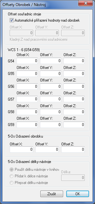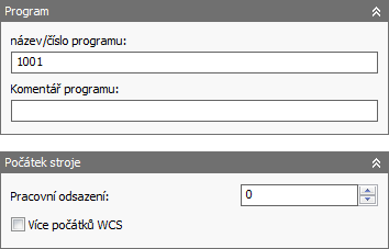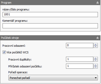 Nastavení pole Odsazení pracovního souřadnicového systému závisí na postprocesoru. V tomto případě je používán postprocesor Fanuc, takže po zadání hodnoty 1 bude použito první pracovní odsazení (G54), další pole je počet duplikátů, v tomto případě 4, a poslední je přírůstek, v tomto případě 1, tj. další odsazení budou G55, G56 a G57.