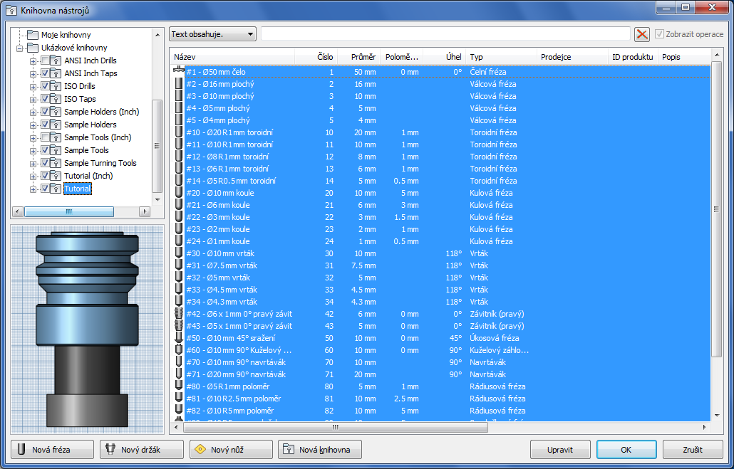 Při kopírování výběru nástrojů v aplikaci Inventor HSM Express v Knihovně nástrojů lze nástroje následujícím způsobem vložit do aplikace Microsoft Excel (nebo jiného programu, který podporuje zpracování textu odděleného tabulátory).