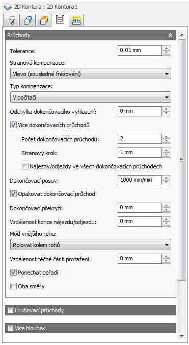 Jedná se o maximální hodnotu vyhlazení použitého v dokončovacích průchodech. Chcete-li předejít vytvoření ostrých rohů v dráze nástroje, použijte tento parametr. V důsledku nastavení tohoto parametru bude v rozích kontury ponecháno více materiálu polotovaru, než bylo vyžádáno.