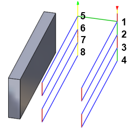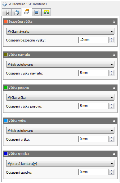 Režim výšky návratu nastaví výšku, do které se nástroj posune před dalším řezným průchodem. Režim výšky návratu musí být nastaven na hodnotu vyšší, než je nastaveno u parametrů Výška posuvu a Horní část. Režim výšky návratu se používá spolu s následným odsazením ke stanovení výšky.