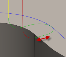 Přidává se k hloubce dráhy nástroje, zatímco nástroj zůstává v kontaktu s vybranou hranou prostřednictvím úpravy radiálního odsazení dráhy nástroje.