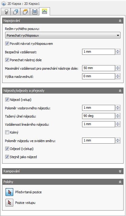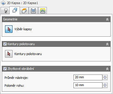 Operace 2D kapsa vytvoří kapsovací trajektorii nástroje ze zřetězených kontur, nikoliv z povrchů nebo těles. U stěn lze definovat úhel zúžení. Vybrat lze také pozice předvrtání a vstupů.