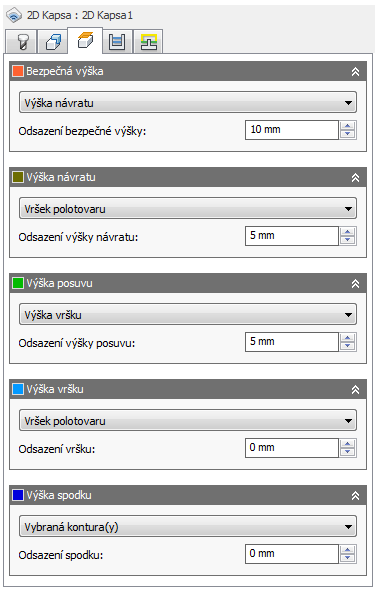 Režim výšky návratu nastaví výšku, do které se nástroj posune před dalším řezným průchodem. Režim výšky návratu musí být nastaven na hodnotu vyšší, než je nastaveno u parametrů Výška posuvu a Horní část. Režim výšky návratu se používá spolu s následným odsazením ke stanovení výšky.
