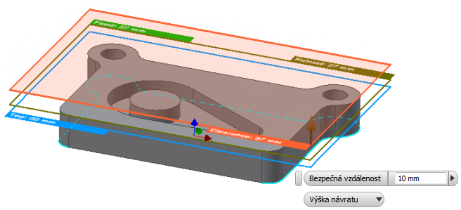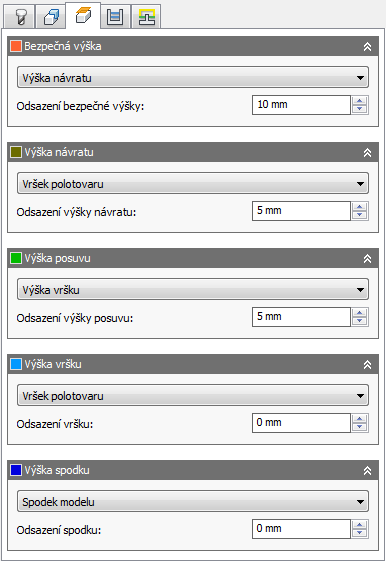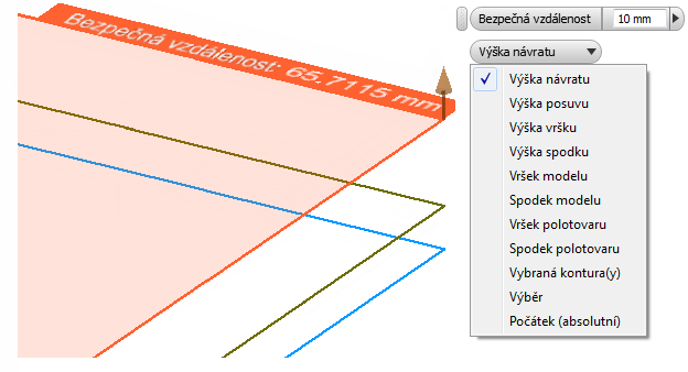 Pokud například vyberete možnost Výška návratu v rozevíracím seznamu Bezpečná výška a odsazení bezpečné výšky je 5 mm, skutečná bezpečná výška bude 5 mm nad výškou návratu.