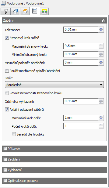Maximální hodnota vyhlazení použitá v hrubovacích záběrech. Chcete-li předejít vytvoření ostrých rohů v dráze nástroje, použijte tento parametr.