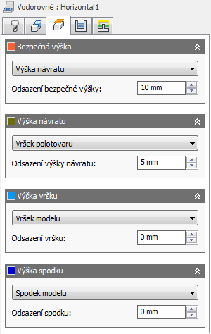 Výška návratu určuje výšku, do které se posune nástroj před dalším řezným záběrem. Výška návratu musí být nastavena na hodnotu, která je vyšší než hodnota parametrů Výška posuvu a Vršek. Výška návratu se používá spolu s následným odsazením k určení výšky.