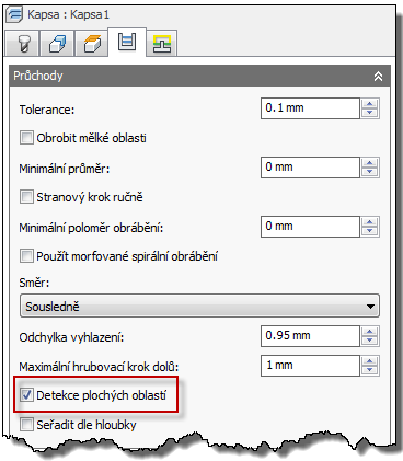 3D obráběcí strategie (Adaptivní obrábění a Kapsovací obrábění) a strategie dokončování Konturové mají na kartě Záběry možnost nastavení Detekce plochých oblastí. Když je tato možnost povolena, strategie zjistí všechny ploché oblasti a upraví krok dolů tak, aby axiální přídavek na těchto plochých oblastech byl ponechán.