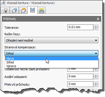 Možnost Víceosá kontura umožňuje kompenzovat nástroj na levé a pravé straně vybraných kontur.