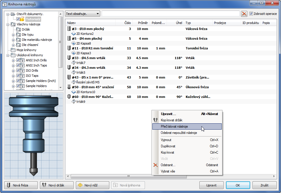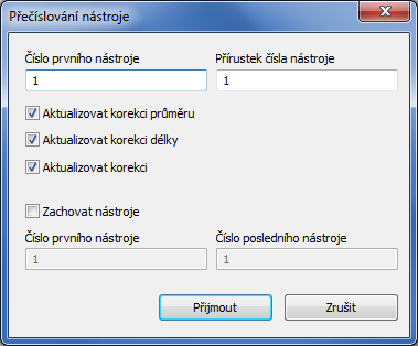 Funkci přečíslování lze použít, pokud chcete, aby v magazínu nástrojů byly pouze nástroje, které vyžaduje konkrétní úloha.