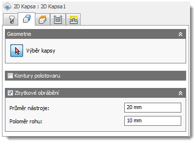 Chcete-li zbytkově hrubovat 2D kapsu, zaškrtněte políčko Zbytkové obrábění na kartě Geometrie a zadejte průměr a rohový poloměr nástroje, který byl v geometrii použit dříve.