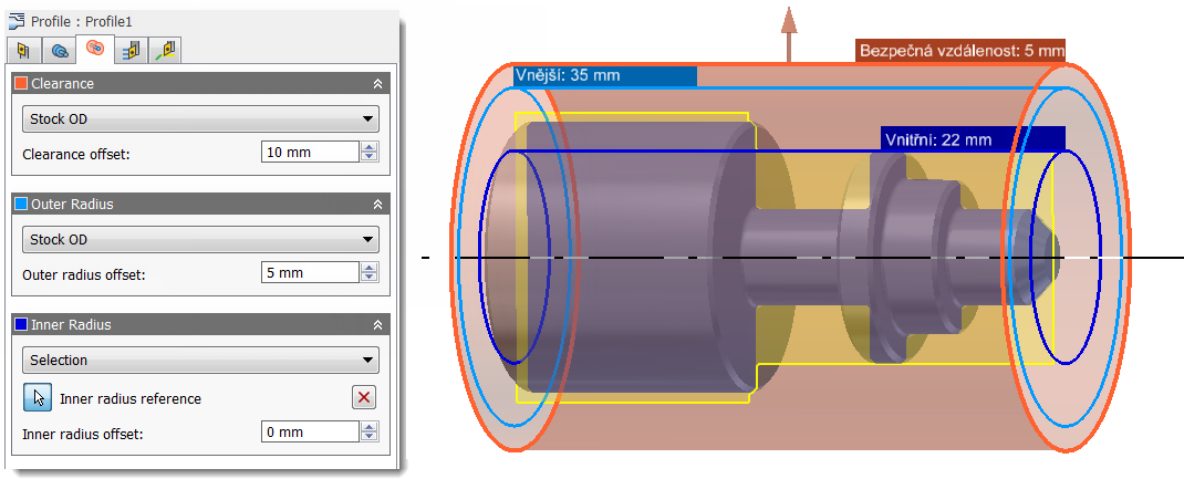 Výběr plochy reference vnitřního poloměru v operaci Soustružení profilu