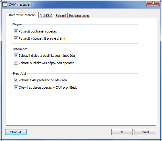 Dialog Možnosti CAM. Výchozí nastavení je možné kdykoli obnovit kliknutím na tlačítko Obnovit, které se nachází na každé kartě.