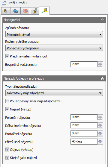 Parametr Protažení nájezdu je nastaven na hodnotu 1 mm.