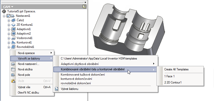 Novou operaci lze ze šablony vytvořit pomocí možnosti Vytvořit ze šablony také dostupné v místní nabídce Prohlížeče CAM. Pod touto položkou nabídky jsou automaticky uvedeny všechny šablony uložené v naposledy vybrané složce šablon. Jak je znázorněno na obrázku níže, složené šablony jsou uvedeny jako podnabídky, což umožňuje snadno vytvářet jak operace pro všechny šablony operací (možnost Vytvořit všechny šablony), tak i operace z jednotlivých šablon operací.