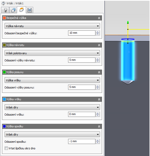 Dolní výška jako „Vršek díry“ za použití odsazení -1 mm. Při tomto nastavení se bude vrtat do hloubky 1 mm od horní hrany díry. Použití tohoto nastavení je efektivní, pokud se navrtává více vybraných děr.