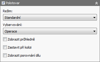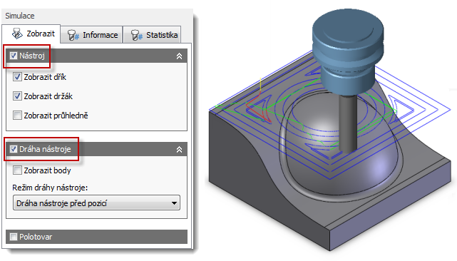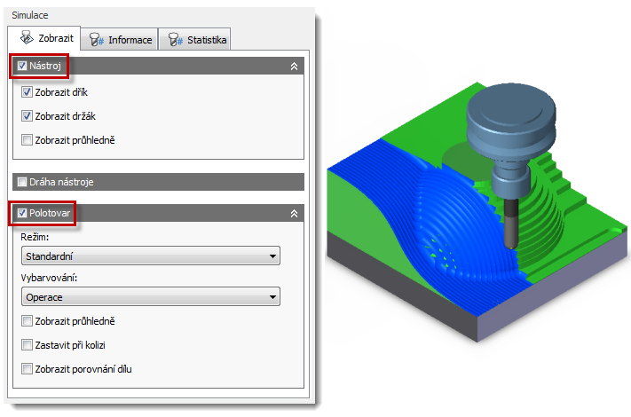 Nad rámec běžného zobrazení simulace je možné v normální simulaci zobrazit polotovar zaškrtnutím políčka Polotovar. Je také možné zobrazit nástroj, trajektorii nástroje a polotovar samostatně nebo společně zapnutím nebo vypnutím odpovídajících možností Nástroj, Trajektorie nástroje a Polotovar.