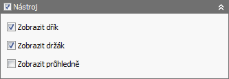 Ve skupině Nástroj lze zapínat a vypínat viditelnost dříku a úchytu nástroje během simulace. Lze také určit, aby byly zobrazeny průhledně, což umožňuje vidět přímo přes ně.