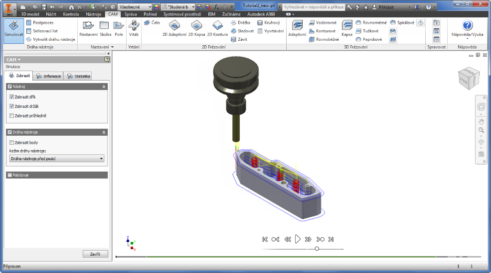 Simulace – pozici aktuálního nástroje je možné ovládat na posuvníku pozice umístěném v přehrávači simulace v dolní části oblasti zobrazení simulace