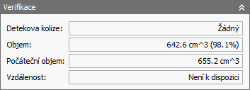 Ve skupině Ověření je případně zobrazen počet kolizí mezi dříkem nebo úchytem a obrobkem. Je zde také uvedena hodnota Počáteční objem udávající celkový objem původního polotovaru. Hodnota Objem udává objem polotovaru odstraněného v průběhu simulace.