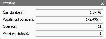 Skupina Statistika obsahuje informace o celé simulované trajektorii nástroje. Jsou zobrazeny tyto aktuální údaje: celkový čas obrábění, celková vzdálenost obrábění, počet provedených operací a počet výměn nástrojů. Je třeba brát ohled na to, že jako čas obrábění je udáván hrubý odhad, který se může značně lišit od skutečného času obrábění po následném zpracování.