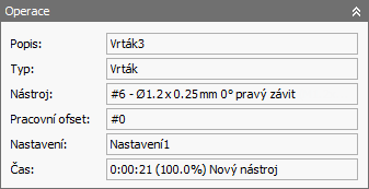 Ve skupině Operace jsou zobrazeny informace o dané operaci v rámci strategie obsahující aktuální pozici nástroje nebo zvýrazněnou pozici. Je zobrazen aktivní nástroj a číslovaný popis operace zadaný v dialogu Operace pro danou strategii.