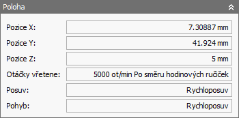 Skupina Poloha obsahuje informace o aktuální pozici nástroje. Tyto informace zahrnují aktuální pozici, rychlost vřetena, rychlost posuvu a pohyb. Mimo režim animace se tyto informace vztahují na aktuálně zvýrazněnou pozici, pokud je aktivní, nebo na aktuální pozici nástroje, zatímco v režimu animace je vždy zobrazena aktuální pozice nástroje.