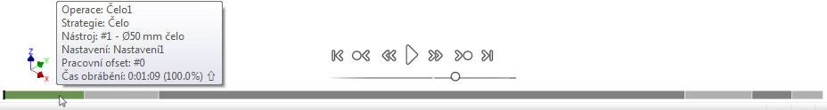 Každý segment osy představuje jednu operaci a jeho délka odpovídá délce trajektorie nástroje této operace. Tím je umožněno snadné vizuální vyhledání konkrétního časového bodu v průběhu simulace. Při přesunutí ukazatele myši nad ovládací segment se zobrazí bublinková nápověda udávající strategii, nástroj, název nastavení, posunutí polohy a čas obrábění pro danou operaci, jak je znázorněno na obrázku výše.