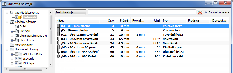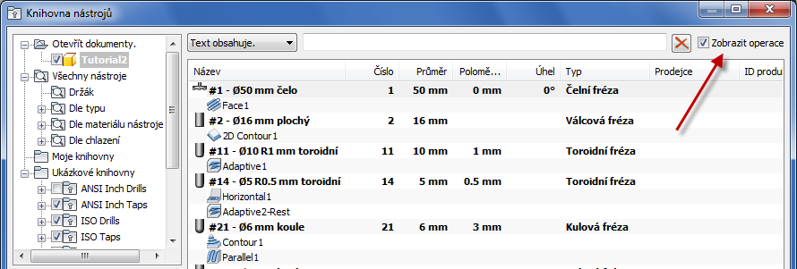 Knihovna nástrojů se zapnutou možností Zobrazit operace uvádějící v seznamu nástrojů jak nástroje, tak operace