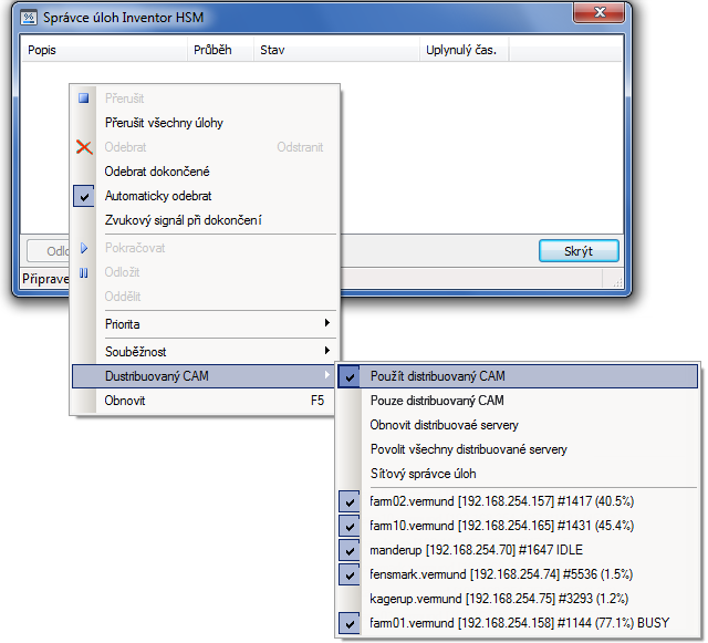 Pokud je distribuovaný systém CAM k dispozici, použije se automaticky. Distribuovaný systém CAM lze ručně zapnout a vypnout ve Správci úloh aplikace Inventor HSM kliknutím pravým tlačítkem a výběrem příslušné položky v místní nabídce. Distribuovaný systém CAM sleduje všechny dostupné prostředky ke zpracování, což umožňuje vybrat nejvhodnější stanici k distribuci výpočtů drah nástrojů.