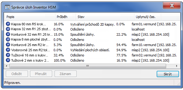 Správce úloh aplikace Inventor HSM s povoleným sloupcem Server zobrazuje, které pracovní stanice se využívají. V tomto případě se výpočty drah nástrojů provádějí ve čtyřech různých pracovních stanicích a v místní pracovní stanici.