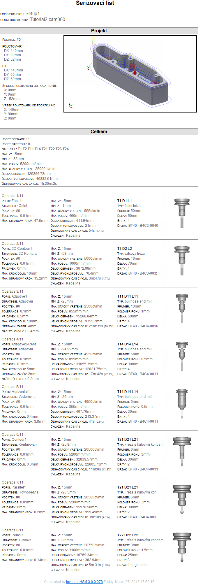 Funkce List nastavení umožňuje vytvořit přehled programu NC pro operátora CNC. Aplikace Inventor HSM zahrnuje několik listů nastavení. Výchozím typem je list nastavení HTML, který je také plně přizpůsobitelný.