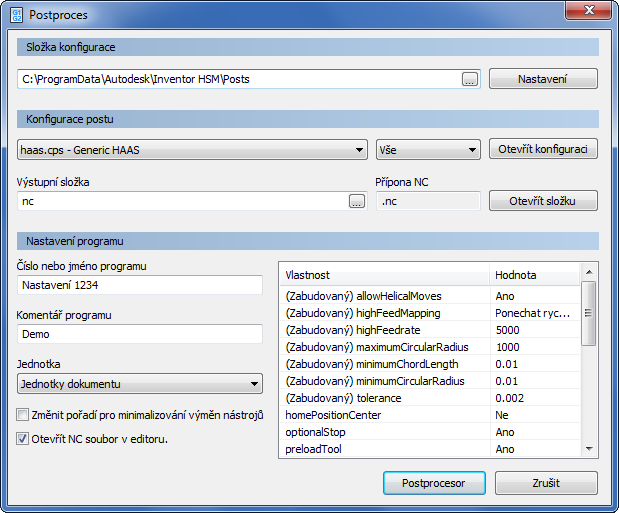 Při prvním otevření dialogu Následně zpracovat je prohledána složka s konfiguracemi postprocesoru k zjištění výchozích vlastností a jsou zpřístupněny všechny pracovní konfigurace.