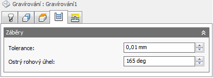 Pomocí tlačítka Výběry kontury vyberte profily geometrií, které mají být gravírovány. Souvislé geometrie jsou automaticky zřetězeny. Gravírování je strategie, při které nástroj uprostřed sleduje vybrané kontury tak, že se nástroj zkosení dotýká vybraných hran. Při změnách šířky obráběné oblasti se nástroj posouvá nahoru a dolů.