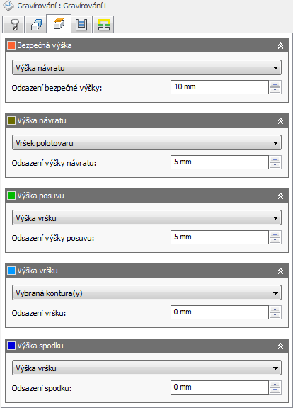 Výška návratu určuje výšku, do které se posune nástroj před dalším řezným záběrem. Výška návratu musí být nastavena na hodnotu, která je vyšší než hodnota parametrů Výška posuvu a Vršek. Výška návratu se používá spolu s následným odsazením k určení výšky.