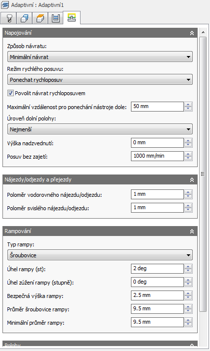 Jedná se o požadovaný úhel zúžení šroubovicových ramp. Chcete-li udržet dřík nástroje v malé vzdálenosti od polotovaru a zlepšit možnosti úniku třísek během rampování, použijte tuto možnost.