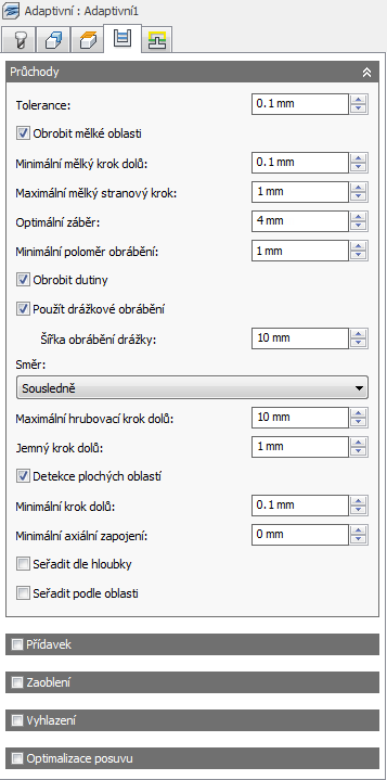 Tento parametr určuje stranový krok, který bude použit při detekování oblastí, do kterých by měly být vloženy dodatečné úrovně osy Z. Pokud by použití normálního kroku dolů znamenalo stranový krok větší než daná hodnota, budou dodatečné úrovně vkládány, dokud nebude dosaženo určené hodnoty stranového kroku nebo minimálního kroku dolů.