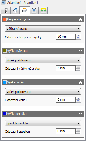 Výška návratu určuje výšku, do které se posune nástroj před dalším řezným záběrem. Výška návratu musí být nastavena na hodnotu, která je vyšší než hodnota parametrů Výška posuvu a Vršek. Výška návratu se používá spolu s následným odsazením k určení výšky.