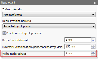 Nastavení výšky zdvihu je dostupné na kartě Napojování u strategií 2D a 3D Kapsa, Adaptivní obrábění a Vodorovné obrábění.