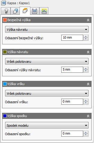 Výška návratu určuje výšku, do které se posune nástroj před dalším řezným záběrem. Výška návratu musí být nastavena na hodnotu, která je vyšší než hodnota parametrů Výška posuvu a Vršek. Výška návratu se používá spolu s následným odsazením k určení výšky.
