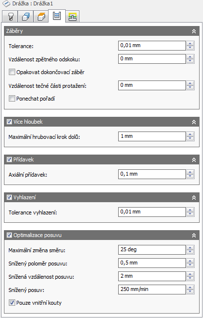 U dokončovacích operací je výchozí hodnota 0 mm/0", tj. nebude ponechán žádný materiál.