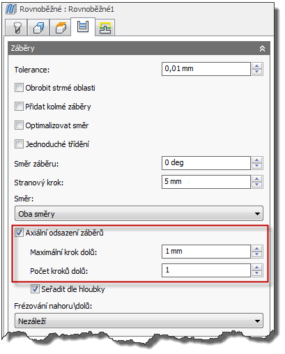 Záběry s axiálním odsazením fungují podobně jako vícenásobné dokončovací kroky dolů ve 2D operacích a jsou užitečné při odebírání pevného množství materiálu pomocí několika kroků. Pokud máte například 1 mm zbývajícího polotovaru, můžete ho odebrat pěti záběry po 0,2 mm pomocí rovnoběžného dokončení.