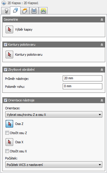 Operace 2D kapsa vytvoří kapsovací trajektorii nástroje ze zřetězených kontur, nikoliv z povrchů nebo těles. U stěn lze definovat úhel zúžení. Vybrat lze také pozice předvrtání a vstupů.