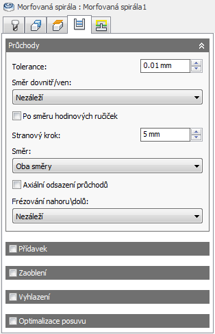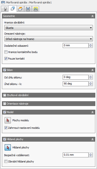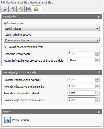Strategie Morfovaná spirála je velmi podobná strategii Spirála. Operace Morfovaná spirála však vytvoří spirálu z vybrané hranice – na rozdíl od operace Spirála, která ořízne vytvořené záběry k hranici obrábění. To znamená, že strategii Morfovaná spirála lze použít na další povrchy, pro které není vhodná strategie Spirála.