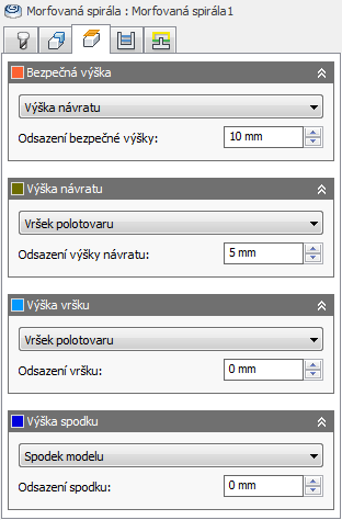 Výška návratu určuje výšku, do které se posune nástroj před dalším řezným záběrem. Výška návratu musí být nastavena na hodnotu, která je vyšší než hodnota parametrů Výška posuvu a Vršek. Výška návratu se používá spolu s následným odsazením k určení výšky.