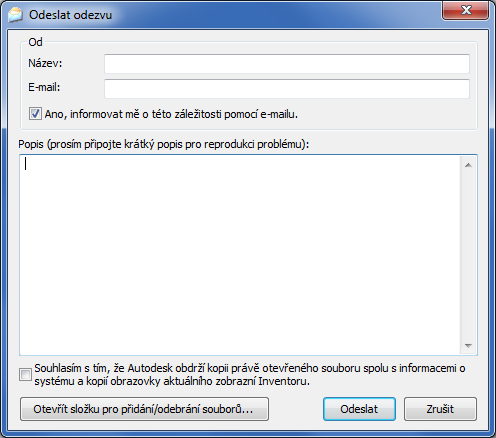 Po kliknutím na tlačítko Odeslat zpětnou vazbu na panelu Nápověda se vám zpřístupní možnosti sdělení problému, se kterým se můžete setkat při práci v aplikaci Inventor HSM, vývojovému týmu Autodesk CAM. K dispozici je dialog (viz níže), který umožňuje odeslat e-mail se snímkem obrazovky, ovlivněnou datovou sadou a komentáři, které chcete zaslat týmu CAM.